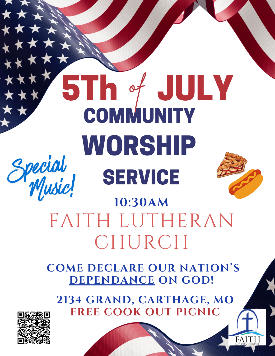 We believe it is the Church's job, not government or politicians, who should lead and shape the moral fabric of our nation. On July 5th we will again invite the community to come stress our dependence upon God on Independence Day! Our nation was established upon God's Word and led the world in ending the evils of slavery. Today more than ever the Church needs to keep promoting Jesus and God's eternal Word among us as we have the freedom to do so. July 5th, 2026