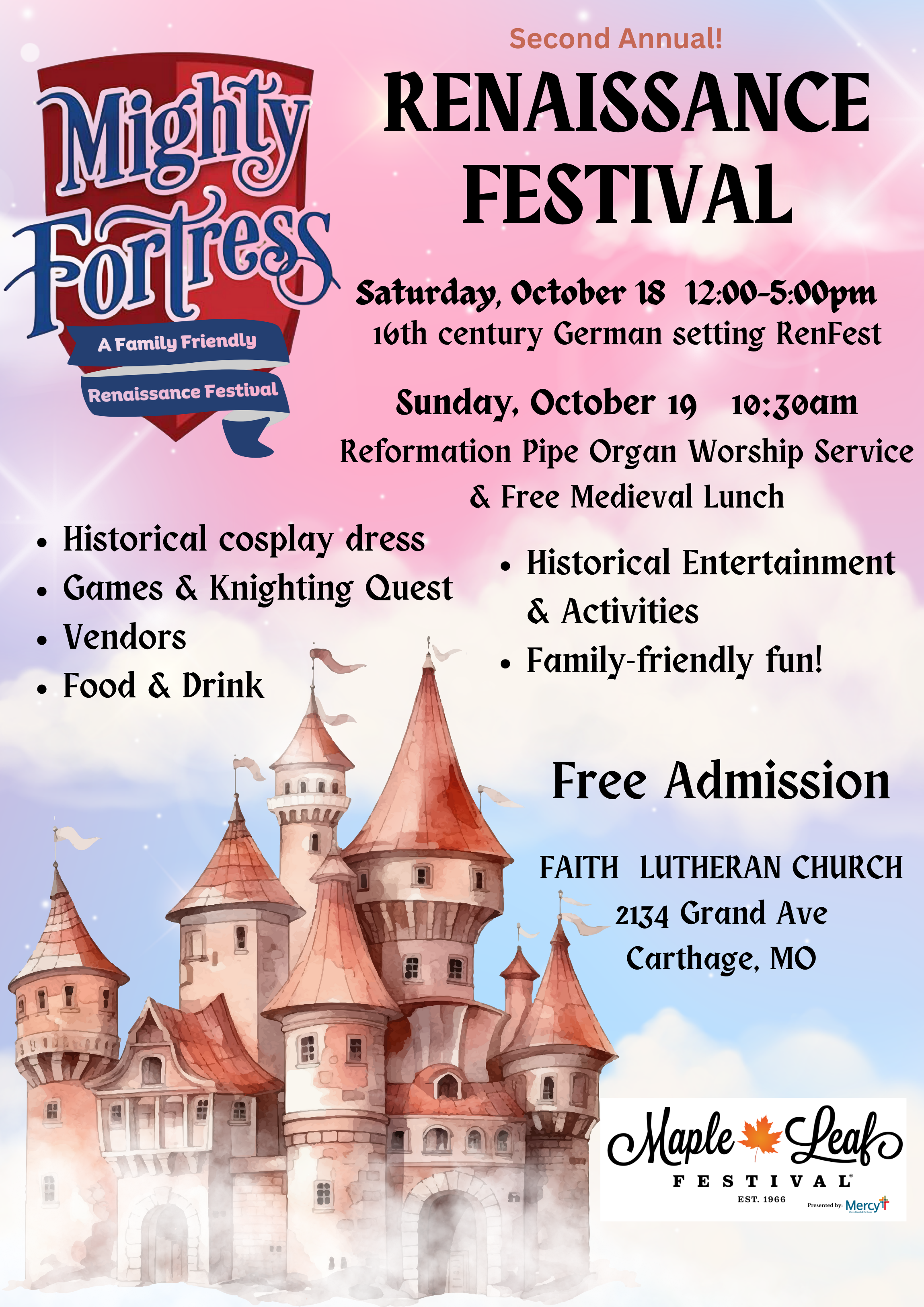 In October, our Church puts on a 16th century RenFest. We are an official Maple Leaf Festival event and have many fun games, food, cosplay, and things to do. You can complete our "noble quest", fighting off evil knights and rescuing the Princess from the sinister dragon. You can also shop at the faire, make a medieval hat or shield, meet Martin Luther, and be knighted by the Queen! This family friendly event is for fun and education! Admission is free.